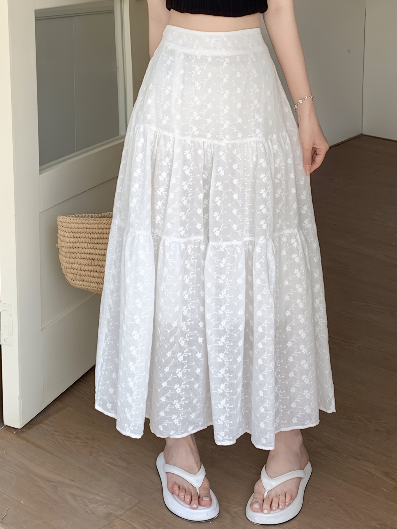 Floral Pattern High Waist Flared Skirt, Casual Tiered Mesh Maxi Skirt, Women's Clothing